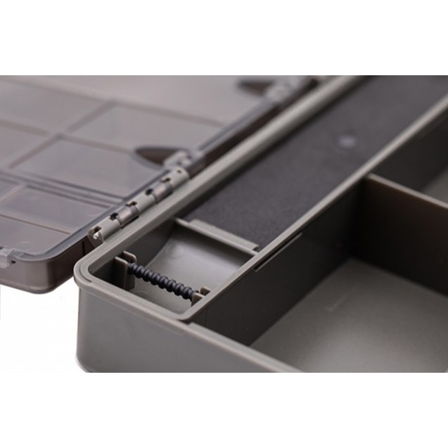 The Basix Tackle Box has been designed to offer plenty of storage space for all your rig bits, whilst making it easy to organise and find them when you need to. It is made from green coloured high impact plastic, which is shock proof, with a translucent lid to enable you to see inside. The lid also features a ruler to enable you to accurately measure your rigs, and is fastened via two latch closures to prevent any chance of it coming open during transit. Inside the lid of the tackle box there are 21 small latched compartments, of various sizes, which are perfect for storing items such as lead clips and swivels. Inside thje box there are two large compartments, with fixed dividers, which are perfect for rig tools, hook link spools and the like. It also features a removeable rig tray, complete with pins, which can be used to store up to eight pre-tied rigs (such as the Basix Hair Rigs), and under this is another long storage compartment.